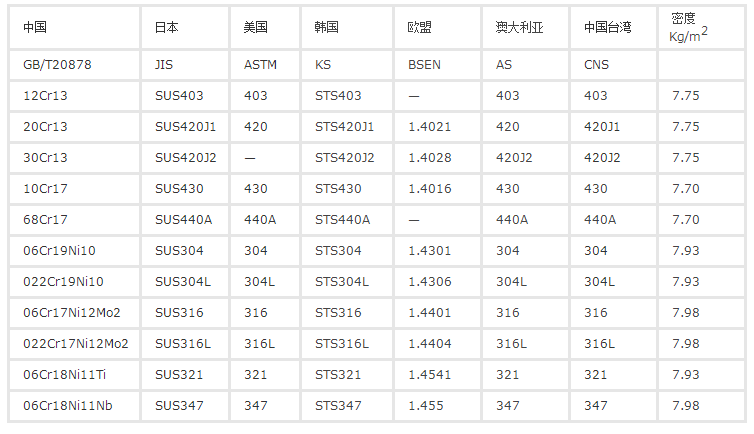 不锈钢板标准钢号密度表: